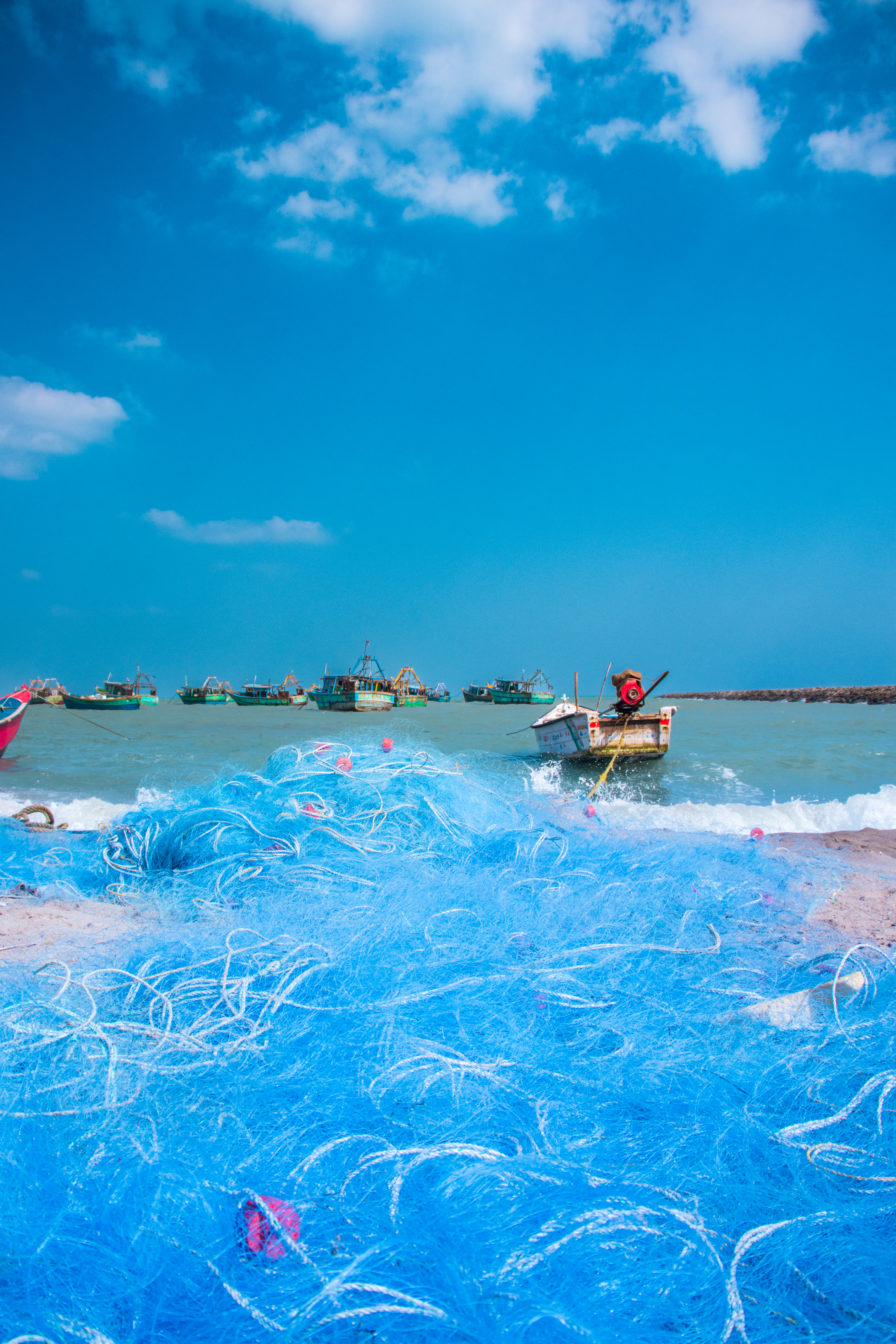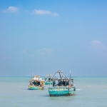 “Scenic view from a fishing boat at sea, with a backdrop of serene blue skies and fluffy white clouds hovering over the tranquil beach.”