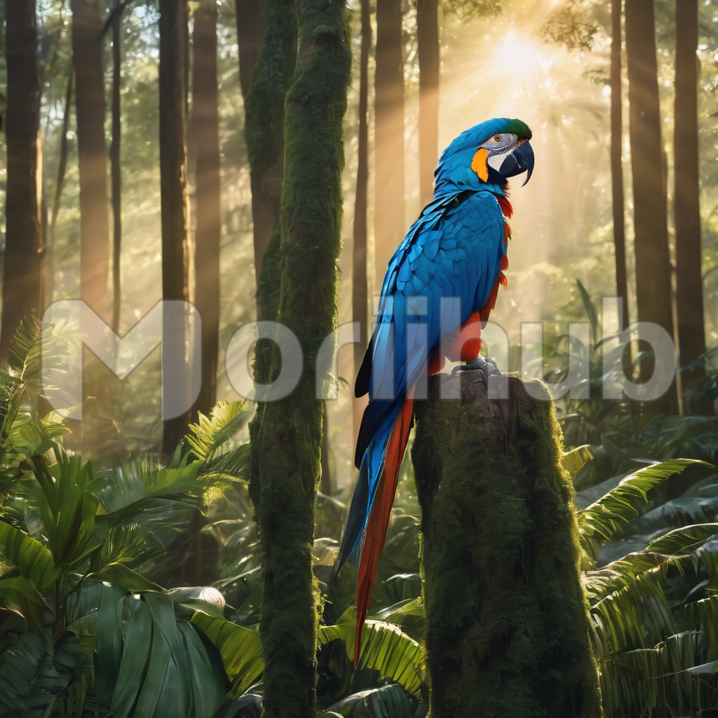 A vibrant parrot perches on a moss-covered tree stump, a burst of color against the lush canvas of the forest. The dense foliage creates a vibrant tapestry, and the parrot’s feathers harmonize with the verdant surroundings. With an alert gaze, it becomes a living jewel in the heart of nature, where the juxtaposition of its brilliance against the rich greenery forms a mesmerizing tableau of avian splendor within the serene forest realm.