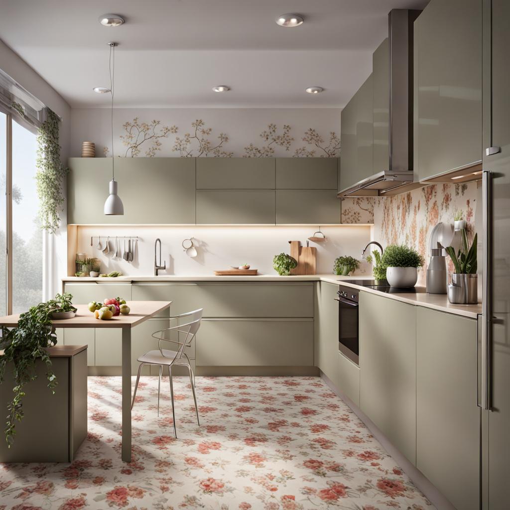This kitchen is a visual symphony of elegance and warmth, with enchanting floral designs adorning both the floor and walls. The floor, a canvas of intricate patterns, blooms with vibrant flowers, creating a garden underfoot. The walls, adorned with artistic floral motifs, extend this botanical embrace, fostering a harmonious connection with nature. The colors dance in muted yet captivating tones, elevating the kitchen to a haven of both culinary creativity and aesthetic delight, where each step feels like a stroll through a blooming meadow.