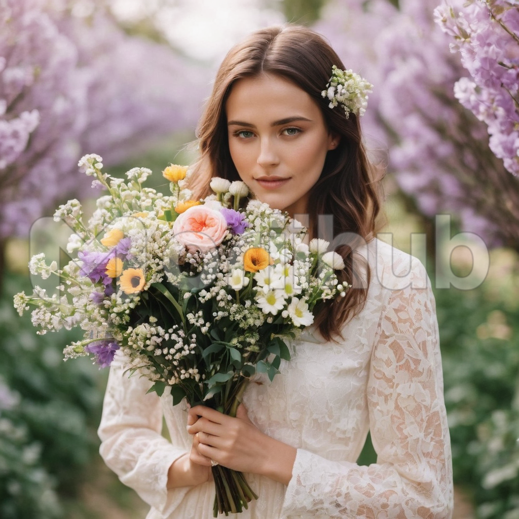 Amidst a vibrant floral field, a woman stands as a living bloom. Clutching a bouquet, she radiates joy, petals adorning her hair. The fragrance of blossoms envelops her, and her gaze, gentle yet determined, fixates on the horizon. A tableau of nature’s embrace and feminine grace, she becomes a living ode to the beauty that blooms both within and around, a harmonious symphony of colors where the woman and the blossoms unite in serene elegance.