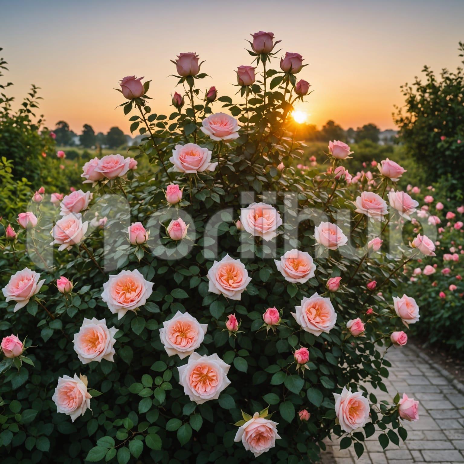 A rose bush rises from the earth, its stems covered in thorns and soft blooms. The flowers are in various stages, some open wide, others still curled inward. Around the bush, the ground is quiet, undisturbed. Above, the sky shifts into the tones of sunset, with muted colors spreading slowly across the horizon. The light falls gently, touching the petals without glare. Leaves hold still in the warm hush, and the scene feels caught between moments. The rose bush doesn’t move, yet its presence holds steady beneath the broad, changing sky.