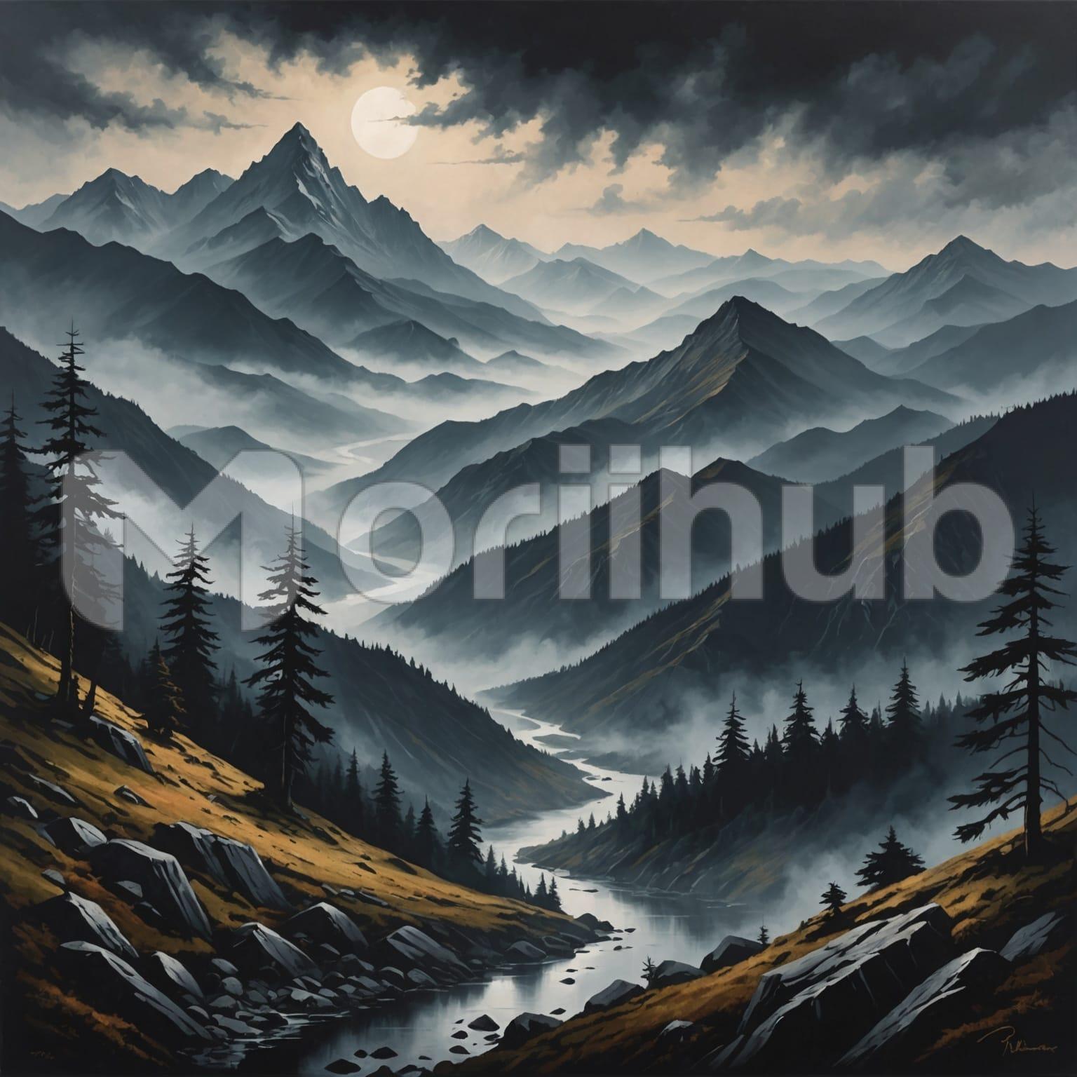 The ink painting depicts a serene scene of a little stream meandering gently across the canvas, its delicate lines capturing the water’s flow. Up ahead, a misty dark mountain looms, shrouded in an enigmatic fog that adds a touch of mystery. Above, a sun is painted ominously in the sky, partially obscured by swirling dark clouds that suggest an impending storm. The contrast between the tranquil stream and the foreboding mountain creates a dramatic yet calming atmosphere, inviting contemplation and reflection.