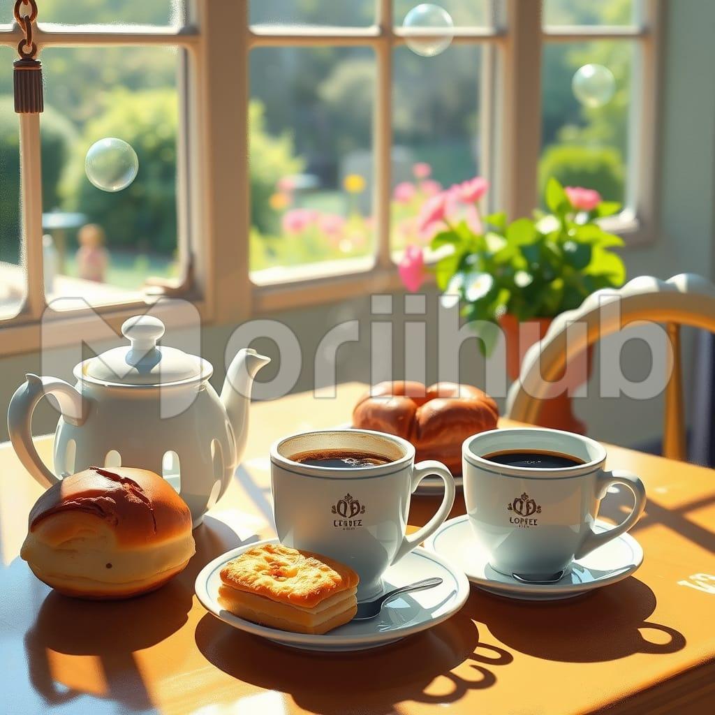 A bright morning scene with fresh fruit, warm pastries, and steaming coffee on the table. Sunlight spills in, highlighting the vibrant colors and inviting aromas. Everything feels crisp, clean, and full of energy—perfect for starting the day with freshness and positivity.