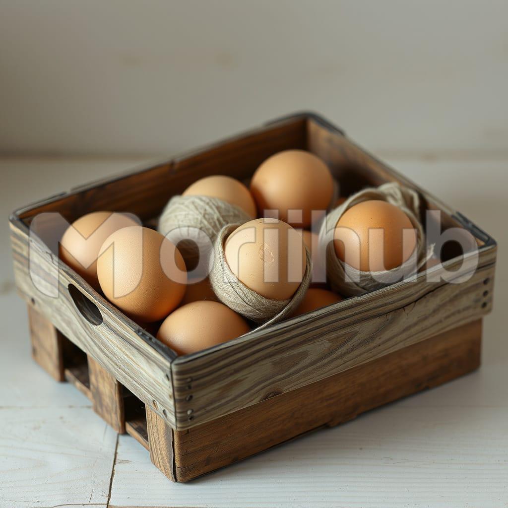 The eggs rest neatly inside a simple box, their smooth, rounded shapes nestled securely. The box itself is unassuming, with small slats for ventilation, ensuring freshness. Each egg, though unadorned, carries a subtle sheen from their natural surface, soft shades of brown and white blending gently together. The box’s edges are slightly worn, a testament to its practical purpose. The stillness of the scene evokes a sense of simplicity, a quiet moment in the daily rhythm of farm life.