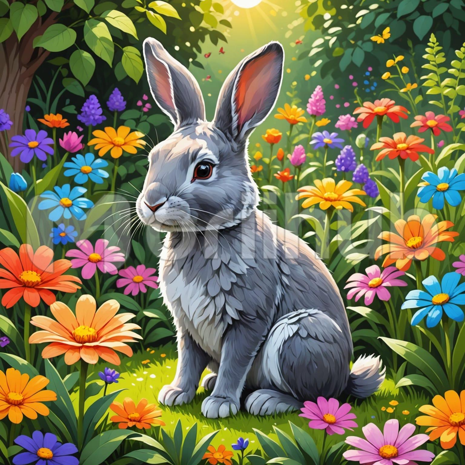 A vibrant cartoon scene shows a bunny in a garden, surrounded by clearly shaped plants and oversized blooms. The bunny, with upright ears and wide-set eyes, is positioned near the center, gazing ahead. Its form is simplified, featuring rounded limbs and smooth edges. Around it, the garden displays large, clean shapes arranged with intention. The setting feels full but balanced, the details clean and arranged to draw focus to the bunny. Nothing moves or distracts; the image holds a quiet, steady charm in its bold arrangement and gentle stillness.