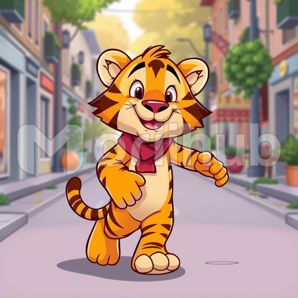 A cartoon depiction of a tiger walking along the street, carrying an air of confidence and warmth. Its face is drawn with a pleasant expression, eyes bright, and stride steady. The street setting is simple, with outlined buildings and a clear path stretching ahead. The tiger’s stripes are well-defined, emphasizing its animated form without complexity. The tone of the piece is cheerful and light, capturing a moment of ease and friendliness. It presents a charming balance of humor, character, and imagination in motion.
