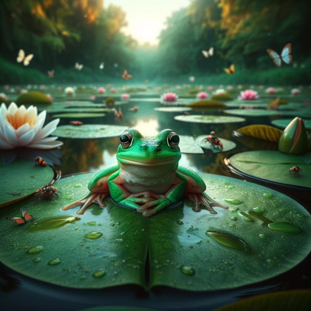In the heart of a tranquil pond, a vibrant green frog perches atop a lily pad, its glossy skin shimmering in the sunlight. With wide, curious eyes, it gazes directly, captivated by its surroundings. The stillness of the water reflects the serenity of the moment, a snapshot of nature’s wonder.