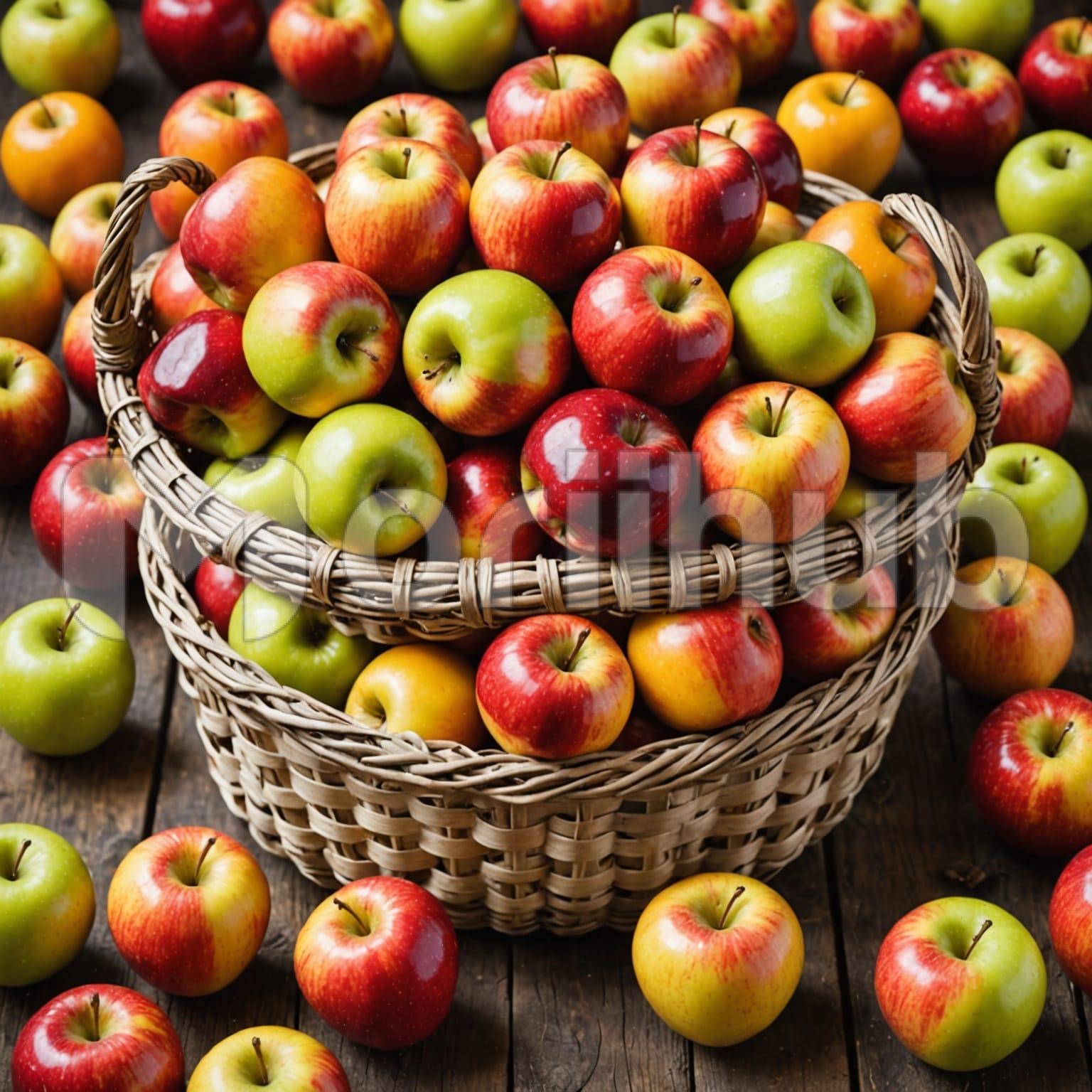 A woven basket rests on a flat surface, filled with apples. Each one sits firmly in place, smooth and rounded, their surfaces clean. A few more lie close to the basket, not arranged but simply there, as if just placed down. The basket’s weave is tightly knit, holding its shape without strain. The focus stays on the apples and how they sit, held together but not crowded. Everything remains as it is, undisturbed in this quiet, simple view.