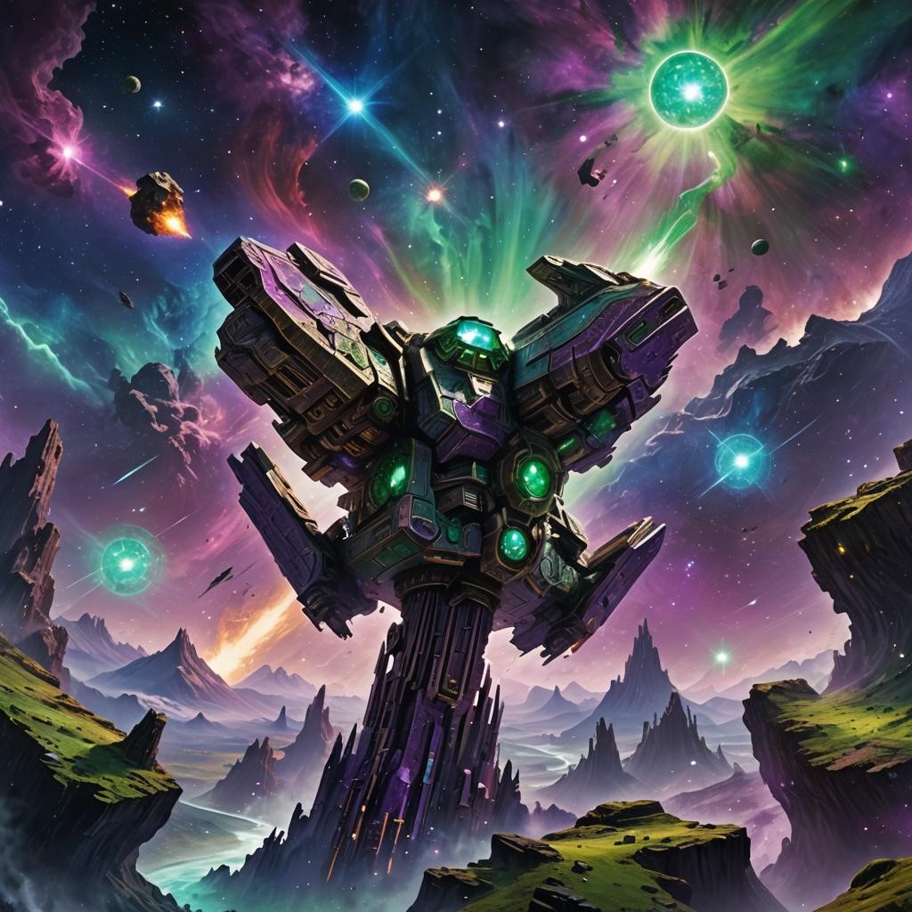 A distant, otherworldly landscape dominated by a colossal, futuristic structure that towers above the alien terrain. The scene is a vibrant blend of advanced technology and cosmic phenomena, creating a breathtaking vista that feels both ancient and futuristic.