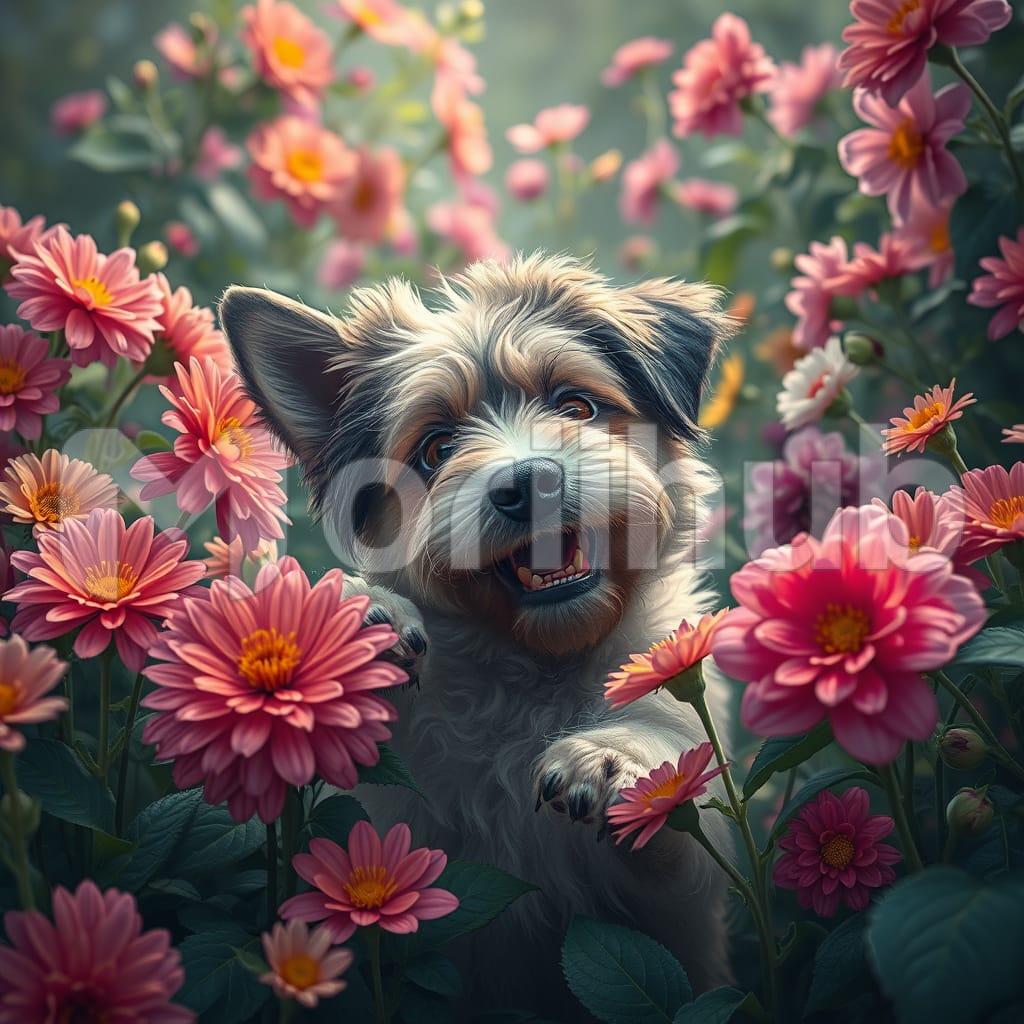 A playful dog, full of energy, is seen attempting to interact with vibrant blooms in a garden. Its paws clumsily swipe at the flowers, unaware of the petals floating around. The dog’s excited expressions and joyful antics bring a humorous charm to the scene, as it playfully explores the colorful blooms.