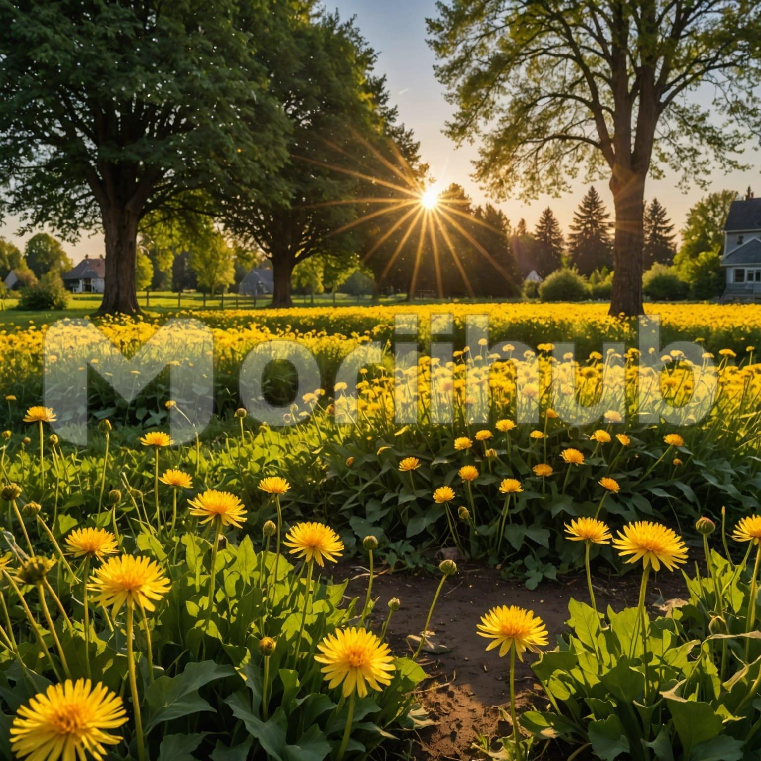 Flowers fill the garden, their forms delicate and varied, creating a gentle foreground of natural charm. Beyond them, trees rise steadily, their shapes giving depth and structure to the scene. The sunset rests on the horizon, casting a soft glow that touches flowers and trees alike, blending the land with the sky. Sparse light filters through, highlighting details and creating subtle contrast. Together, blooms, trees, and fading sunlight form a tranquil composition, a quiet balance of nature’s layers, offering a moment of serene beauty and calm presence.
