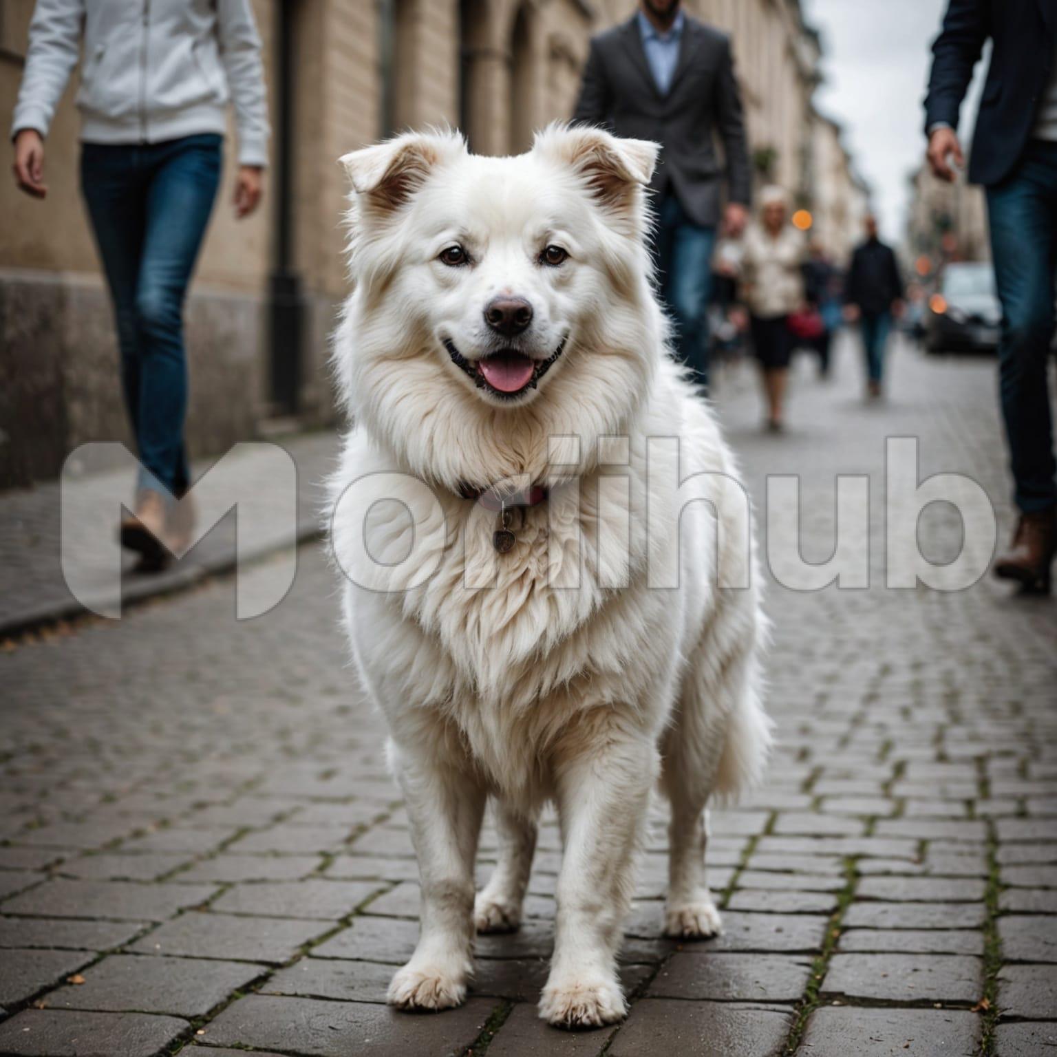 A cute dog walks down the street, its drooped ears giving it an endearing, gentle look. With each step, it moves slowly, its gaze focused on the surroundings. The dog’s soft fur ruffles slightly in the breeze, adding to its charm. People can be seen walking in the background, their presence a quiet part of the scene. Despite the activity around it, the dog remains calm, exuding a peaceful aura. Its relaxed demeanor makes the street feel warmer, as if it belongs to this tranquil moment.