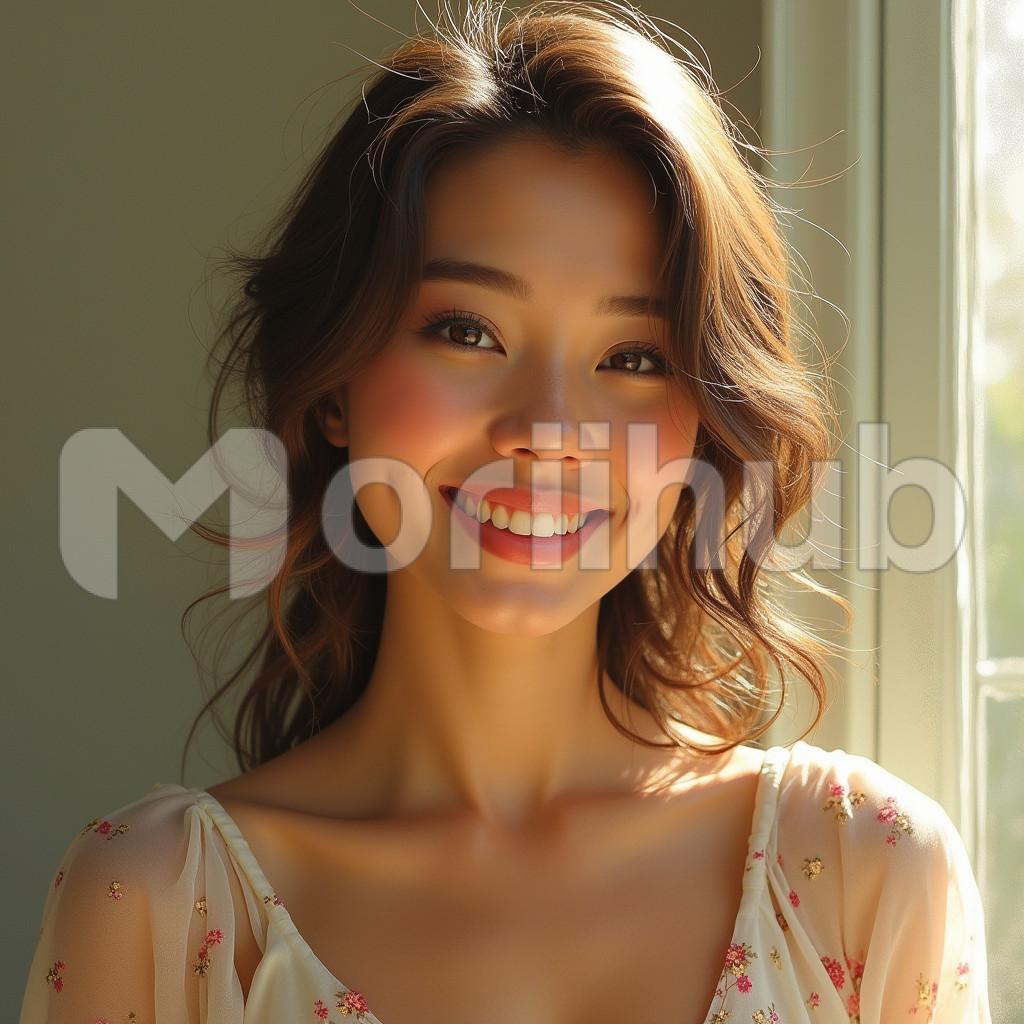 A beautiful woman gazes ahead with a warm, genuine smile that lights up her face. Her expression exudes a quiet confidence and grace, captivating in its simplicity. Her eyes hold a gentle warmth, complementing the natural beauty of her features. There’s a calmness about her, a poise that suggests inner strength and kindness. The subtle curve of her lips and the relaxed look in her eyes create an inviting, approachable aura. She appears both elegant and down-to-earth, radiating a serene charm that draws one in effortlessly.