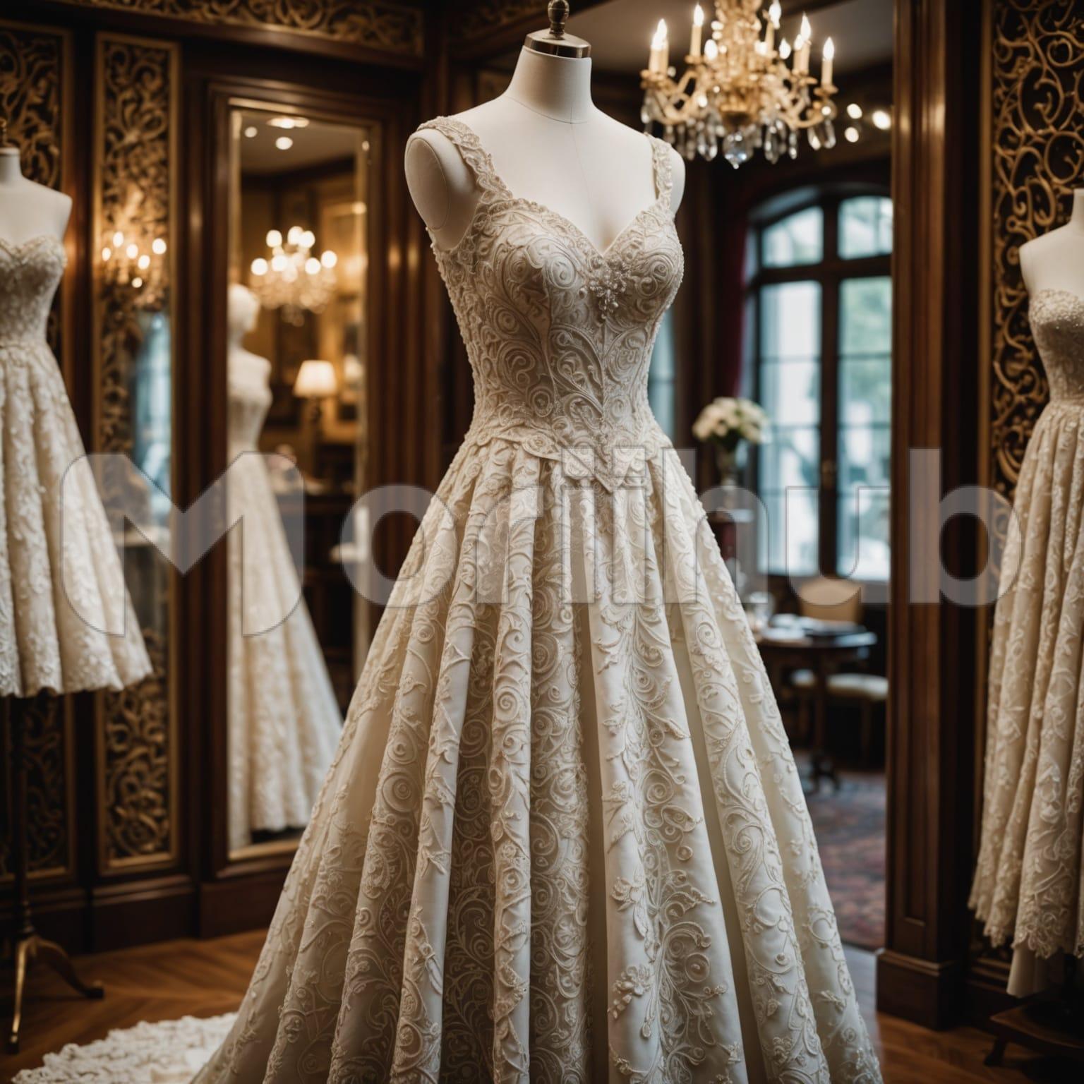 A beautiful gown rests on the mannequin, its flowing fabric cascading in soft folds. The intricate design highlights delicate embellishments, creating a refined elegance. The gown’s silhouette is graceful, hugging the figure before gracefully flaring out. Behind, in the corner, other gowns are partially visible, their subtle details offering a glimpse of the craftsmanship. Each gown complements the next, yet this one stands out, drawing the eye with its timeless beauty and the quiet allure of its design, surrounded by the quiet charm of the others.