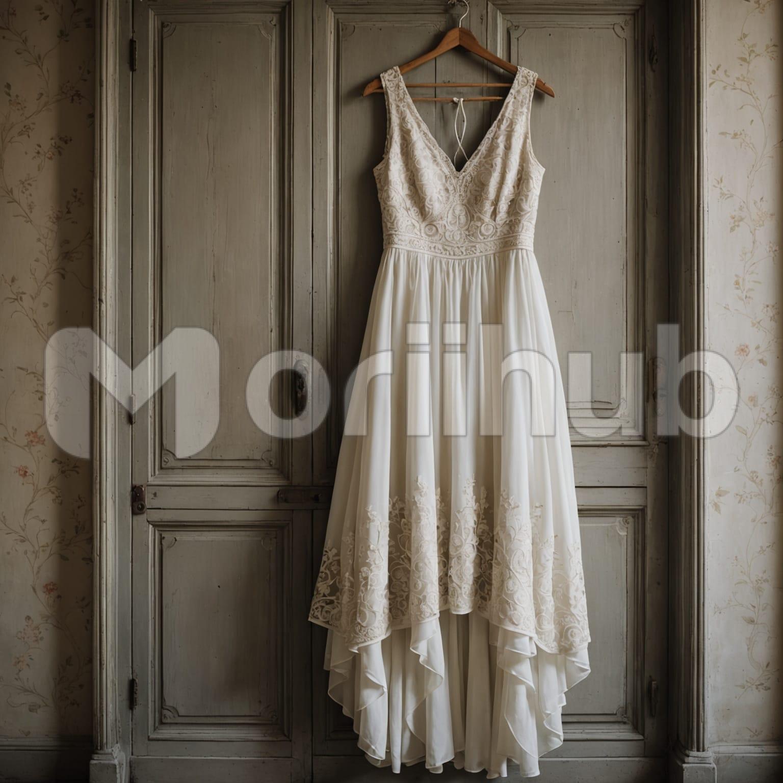 A gown hangs neatly from a simple hanger mounted on the wall. The fabric drapes in soft lines, falling with a quiet elegance. The wall behind it is plain, drawing full attention to the silhouette of the dress. Folds gather slightly at the waist, with the hem trailing just above the floor. There are no distractions nearby—only the garment, presented without embellishment. Light touches one side, emphasizing the texture and form. It rests still, waiting, not worn but not forgotten, offering a quiet presence in the otherwise bare space.