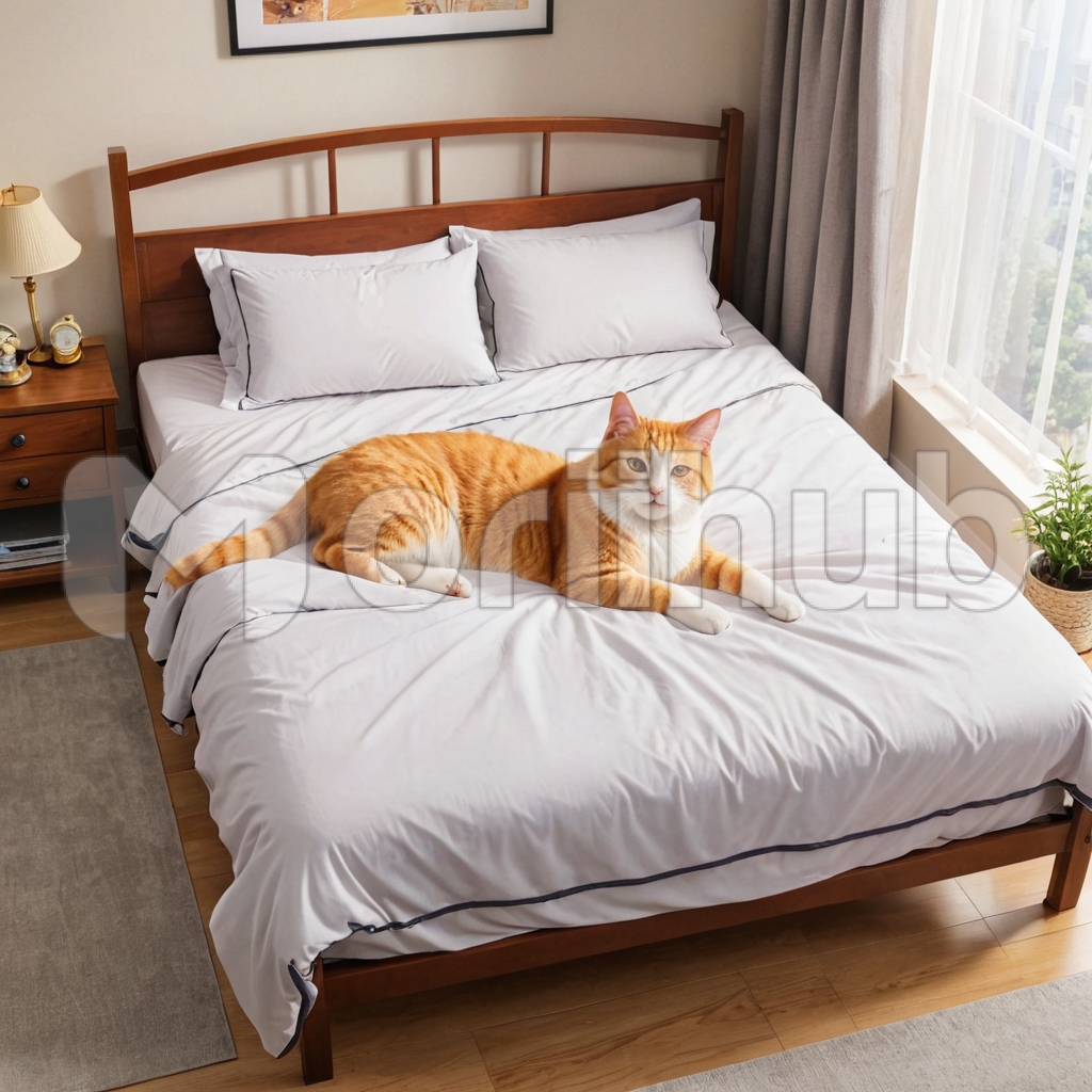 From an aerial vantage, a serene scene unfolds: a cat reclines on a bed, her form a study in tranquility. With eyes fixed on the distance, she exudes an air of quiet contemplation. The soft curves of her body meld seamlessly with the folds of the bed, creating a tableau of peace and repose. Bathed in the gentle glow of ambient light, she embodies a sense of grace and poise. In this moment captured from above, the cat’s presence lends an aura of calm to the space below.