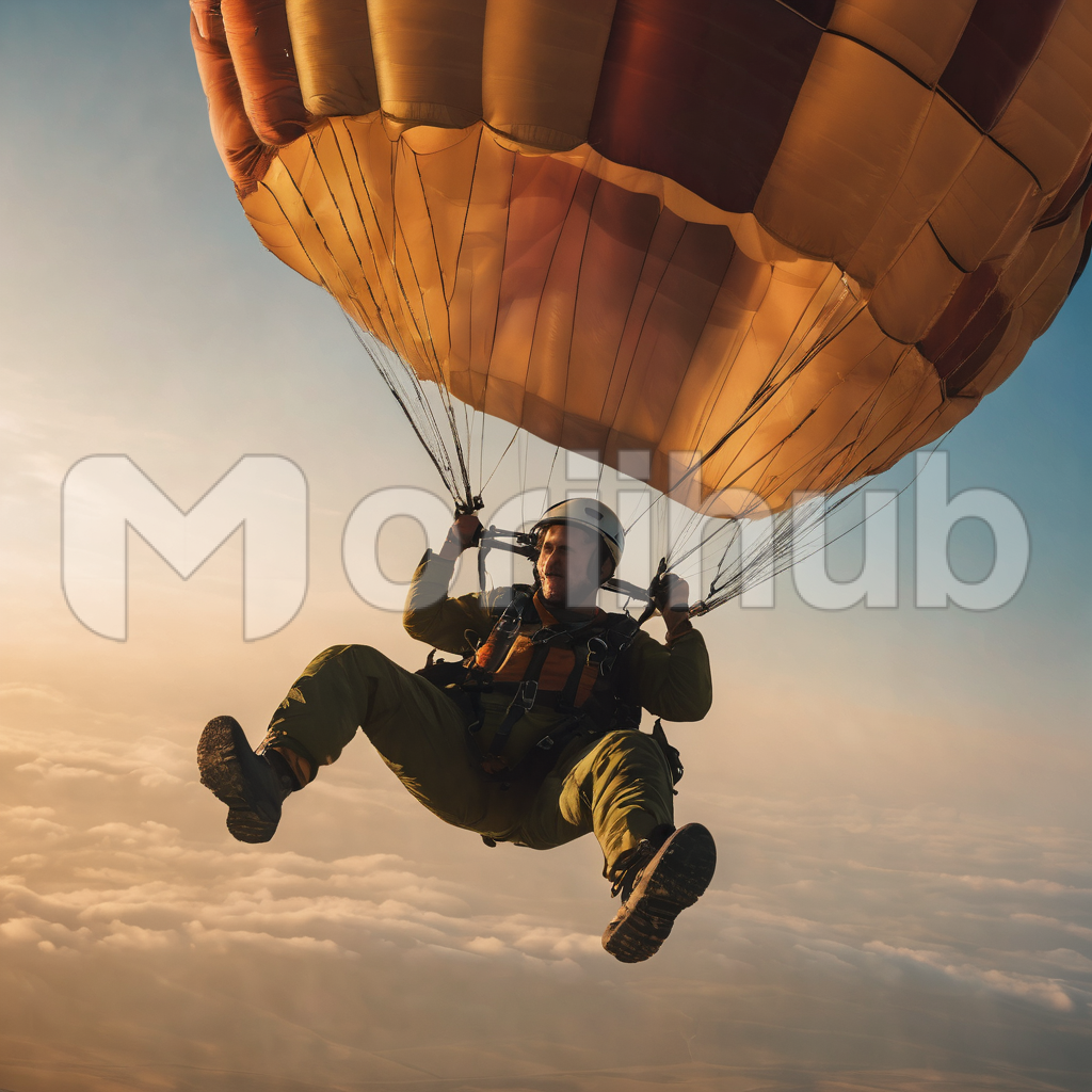 Suspended in mid-air, a daring man gracefully descends with a parachute billowing above. The wind whispers around him as he navigates the open skies, a silhouette against the boundless blue. Adrenaline courses through his veins, and the world unfolds beneath, a patchwork of landscapes, a canvas for the fearless dance between earth and air.