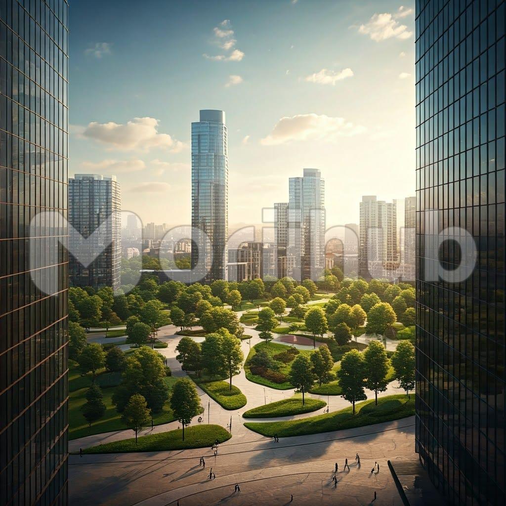 A sweeping view of a garden city reveals sleek, modern buildings intertwined with lush greenery, trees lining every pathway, and vibrant flowers adding color, blending urban sophistication with nature’s beauty in perfect harmony.