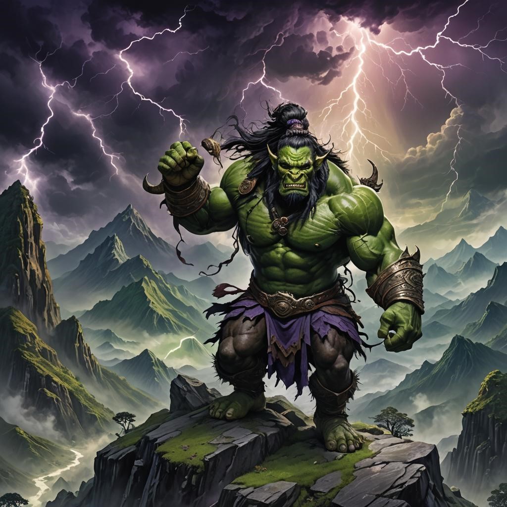 A massive, powerful green-skinned warrior standing triumphantly on a rocky mountaintop, with a backdrop of stormy skies and towering, jagged mountains. The warrior’s imposing physique is highlighted by his bulging muscles, emphasizing his immense strength. His skin is a deep green, contrasting with the dark, turbulent sky above, which is streaked with flashes of lightning.