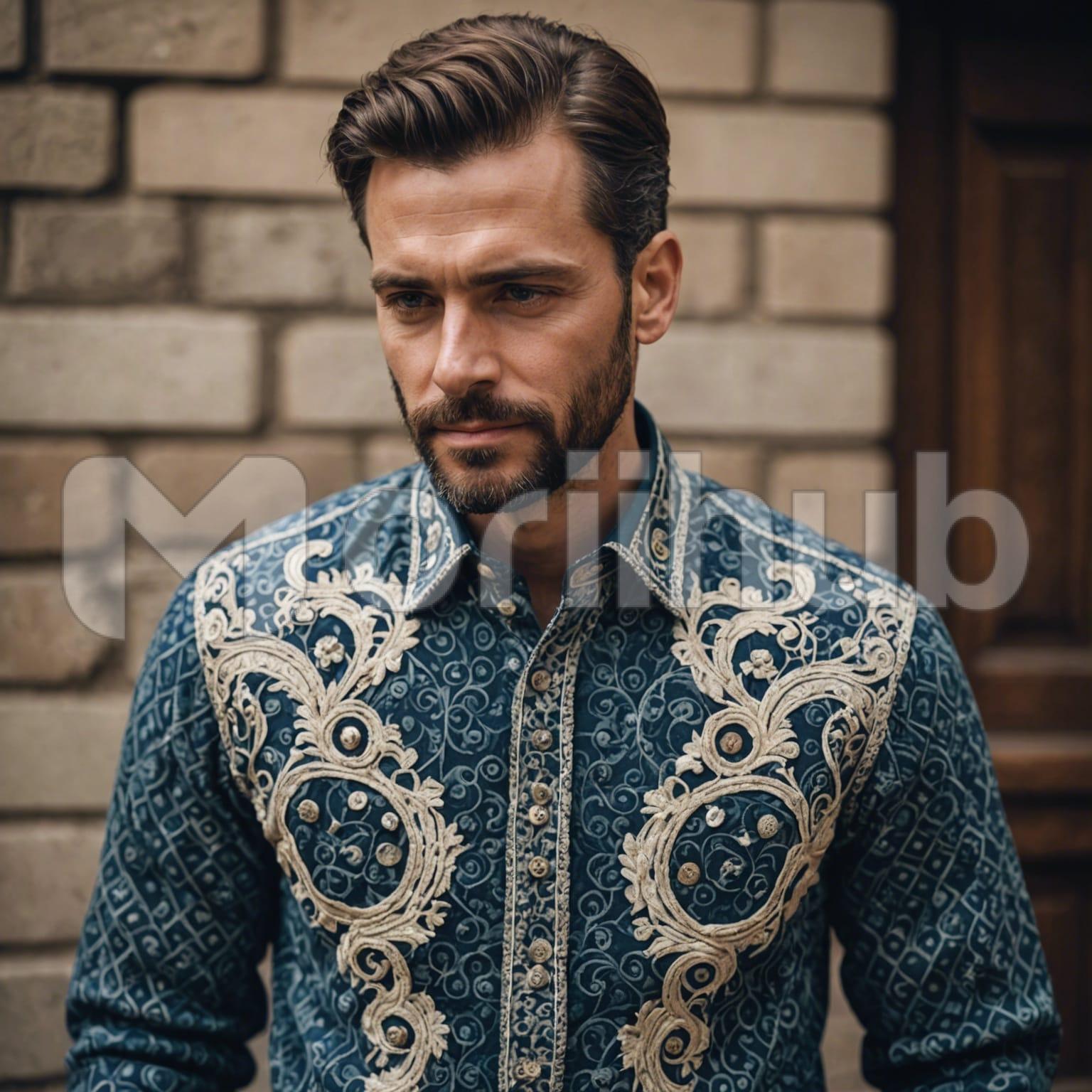 A dapper man stands confidently, donning a well-fitted, long-sleeved shirt that highlights his refined style. His neatly trimmed beard accentuates his sharp features, adding a touch of sophistication to his appearance. The shirt’s crisp lines and the subtle elegance of his attire reflect his attention to detail and taste. His gaze is steady and thoughtful, exuding an air of quiet confidence. With an impeccable sense of grooming and style, he presents a picture of modern elegance and poised charm, effortlessly commanding attention.