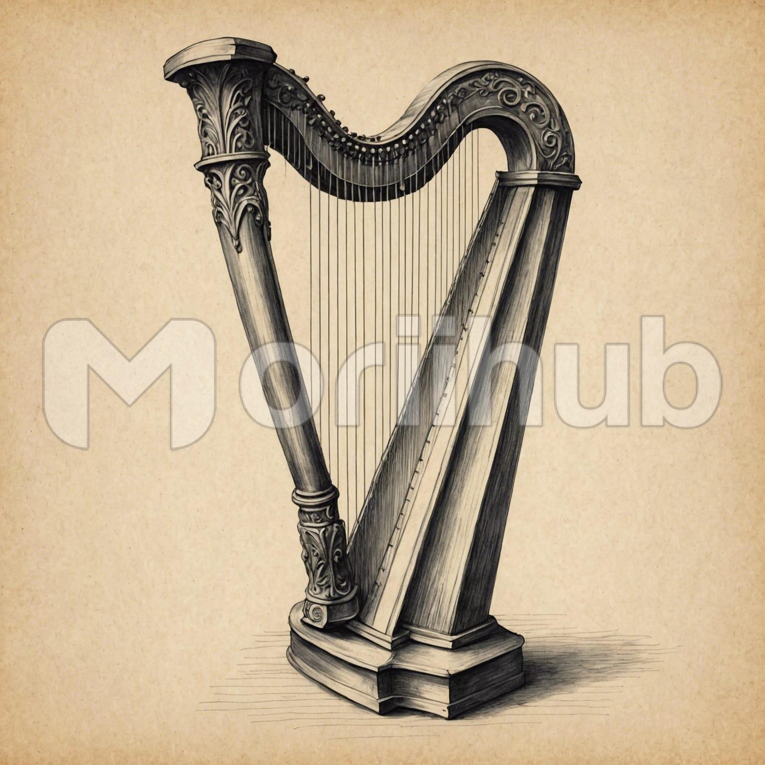 A sketch of a harp graces the page with elegant simplicity against a plain background. The artist’s pencil strokes capture the delicate curves and intricate details of the instrument. The long, slender neck rises gracefully from the finely crafted soundbox, each string meticulously drawn to suggest the potential for melodious music. The base is solid yet artistically rendered, grounding the harp in quiet dignity. This minimalist composition highlights the harp’s classical beauty and timeless elegance, evoking a sense of serene musicality and refined craftsmanship.
