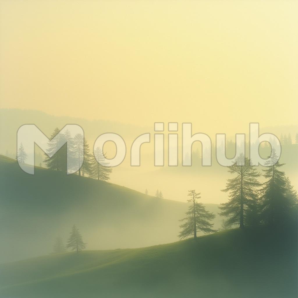 A misty terrain stretches out, shrouded in a soft haze that blurs the edges of the landscape. Trees dot the area, their forms partially obscured by the mist, creating an ethereal, dreamlike atmosphere. The trunks and branches of the trees emerge faintly, their outlines softened by the moisture-laden air. The scene feels quiet and serene, as if nature is holding its breath in the stillness of the moment.