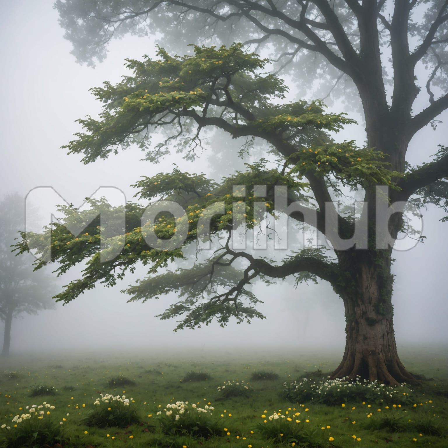 A lone tree stands tall amidst a soft, misty landscape, its branches reaching out into the hazy surroundings. The mist creates an ethereal atmosphere, gently enveloping the tree and blurring the edges of its silhouette. Around the tree, delicate wildflowers scatter the ground, their subtle colors peeking through the mist, adding a touch of life to the serene scene. The combination of the mist, the tree’s enduring presence, and the wildflowers creates a tranquil and almost dreamlike setting, where nature’s quiet beauty takes center stage.