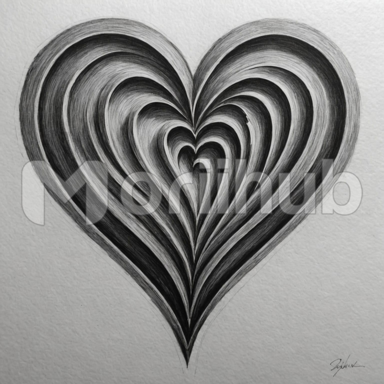 A detailed pencil sketch features a heart shape formed by a series of nested, curved layers, each following the contours of the outer heart. The layers vary in thickness and tone, creating depth and dimension. Darker sections alternate with lighter ones, enhancing the illusion of inward movement. The central point draws the eye, where the smallest inner heart rests. The textured paper adds a soft, tactile quality to the drawing. There are no extra markings—just the layered heart taking center focus in a clean, balanced composition signed subtly in one corner.