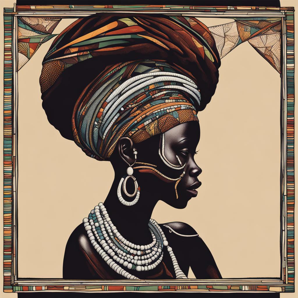 In a mesmerizing portrait, an African woman exudes timeless elegance. Adorned in beads cascading gracefully on her neck, her captivating side profile unveils the intricate details of her headgear embracing her voluminous afro. The play of light and shadow accentuates the contours of her face, revealing a profound beauty that resonates with cultural richness. The painting captures the essence of heritage, celebrating the strength, grace, and regal poise of the African woman, a living embodiment of artistry and tradition.