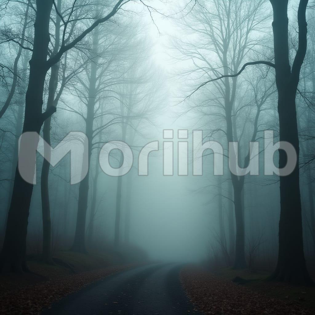A path winds gently forward through foggy woods, flanked closely by trees on either side. Their trunks rise in steady lines, fading gradually into the mist that hangs low, softening the outlines of the forest. The ground is muted beneath the haze, carrying the quiet impression of a trail that continues ahead without haste. Branches stretch upward, their forms blurred, creating an atmosphere of stillness. The fog cloaks the woods in mystery, turning the path into a scene that feels timeless and hushed.