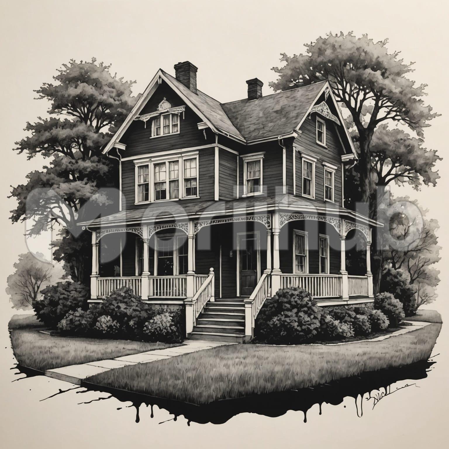 A charming drawing of a house captures its inviting essence, with a quaint structure that exudes warmth and character. In front, neatly trimmed bushes frame the entrance, their lush greenery enhancing the home’s appeal. The house features a cozy porch, inviting visitors to sit and relax. Behind the house, tall trees stand majestically, their branches swaying gently in the breeze, adding depth to the scene. The combination of the well-kept bushes and the towering trees creates a harmonious balance, showcasing a beautiful blend of architecture and nature in this serene setting.
