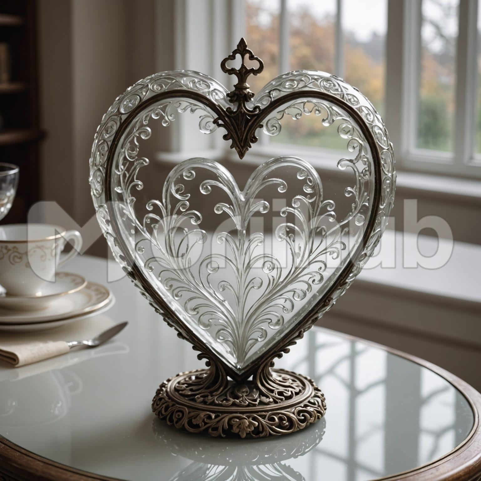 A delicate glass heart sits gracefully on a table, its smooth, transparent surface reflecting the surrounding light. The heart’s edges are softly curved, giving it a gentle, elegant form. Its clarity allows the light to pass through, creating a subtle glow. The decor piece stands alone, its simplicity enhancing its beauty. The clean surface of the table complements the glass heart, creating a serene and sophisticated atmosphere. The overall effect is one of quiet charm and understated elegance.