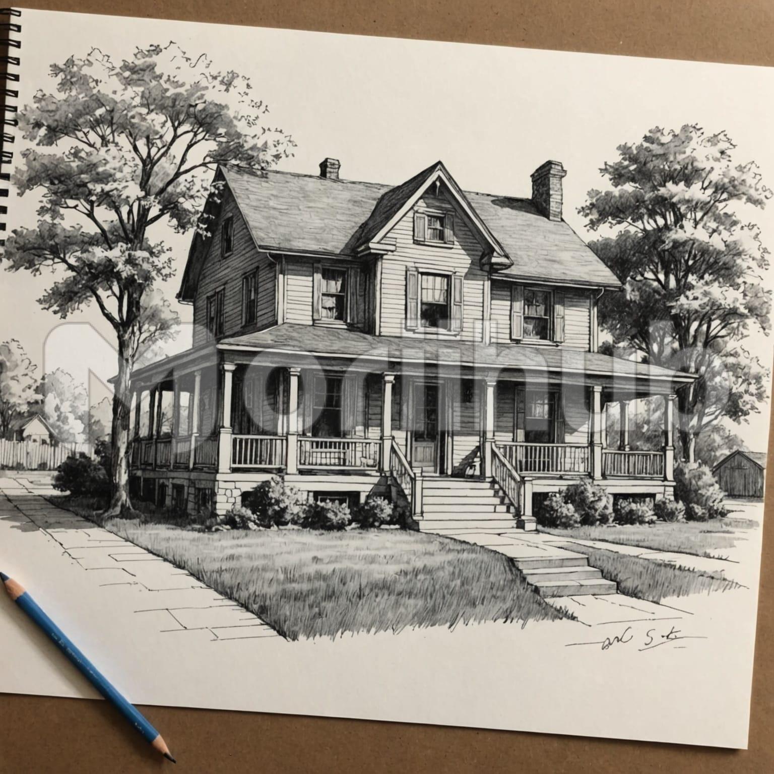 A sketch of a house spreads across the page, drawn with clean, steady pencil lines. The roof angles neatly, and windows are shaded lightly to suggest glass and depth. Trees stand in the corners, their forms built from soft, circular strokes, adding gentle balance to the scene. In front, trimmed shrubs form a tidy border, giving life and texture to the simple composition. The artwork feels calm and inviting, capturing the quiet charm of a well-kept home surrounded by nature’s quiet grace.
