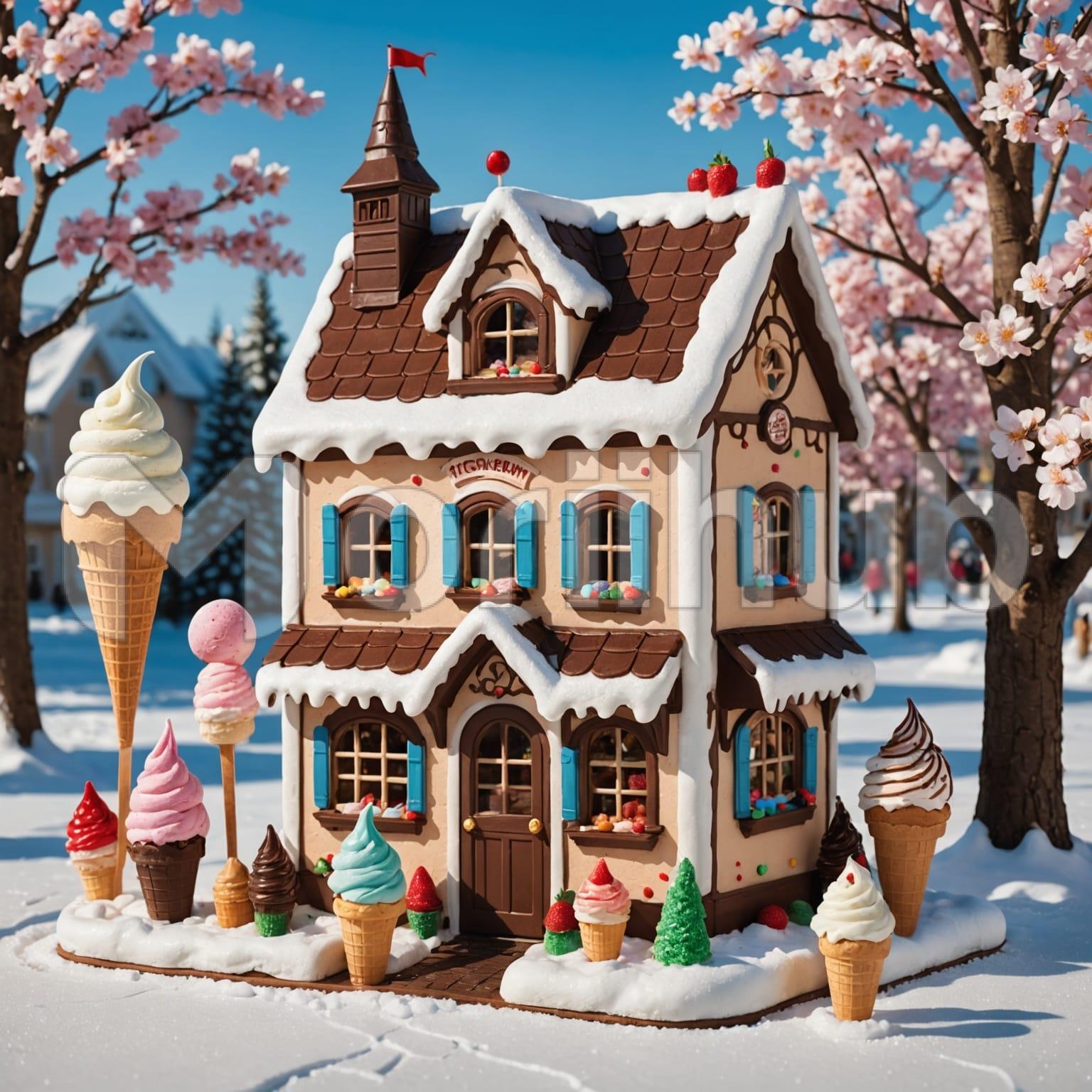 An adorable ice cream house, brightly colored with playful designs, offers a delightful array of treats. The soft serve swirls and vibrant toppings tempt visitors, while the cozy atmosphere invites you to indulge in sweet, creamy delights. The scent of freshly made waffle cones fills the air, making it a perfect treat destination.