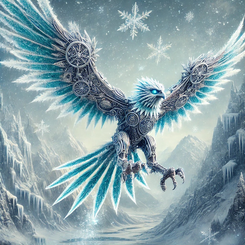 A majestic eagle crafted from shimmering, ice-blue metal with frosty details. Its wings are adorned with sharp, crystalline feathers that glisten like icicles, and as it flies, a trail of frost and snowflakes follows in its wake. The eagle’s eyes glow with a cold, piercing light, and intricate snowflake patterns are etched along its body and wings.