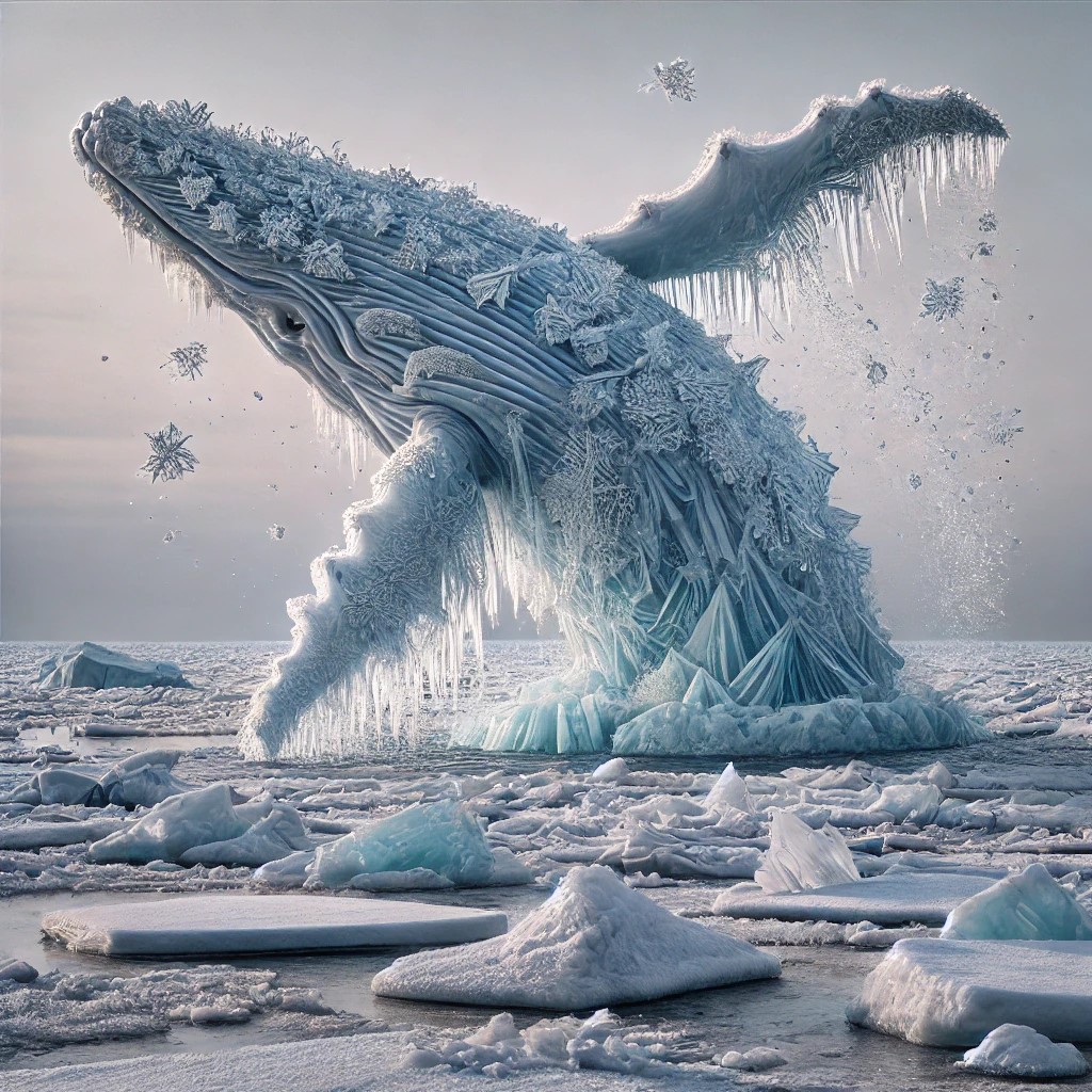 A massive ice whale emerging from a frozen, icy sea. The whale’s body is entirely made of crystalline ice, with jagged, sharp edges and intricate frosty patterns etched across its surface. As the whale breaches, shards of ice and delicate snowflakes scatter from its form, catching the pale sunlight and shimmering in the cold air. Below, the sea is partially frozen, with large icebergs floating on the surface. The sky above is cold and overcast, casting a faint bluish hue over the entire scene, enhancing the chilling atmosphere.