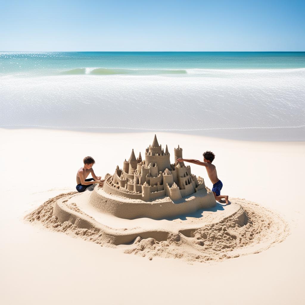 Two enthusiastic kids, their faces lit up with excitement, embark on a sandy adventure at the beach. With tiny hands and boundless imagination, they meticulously construct a majestic castle, a testament to their teamwork. Laughter echoes as waves provide the soundtrack to their joyful creation, blending youthful exuberance with the coastal serenity.