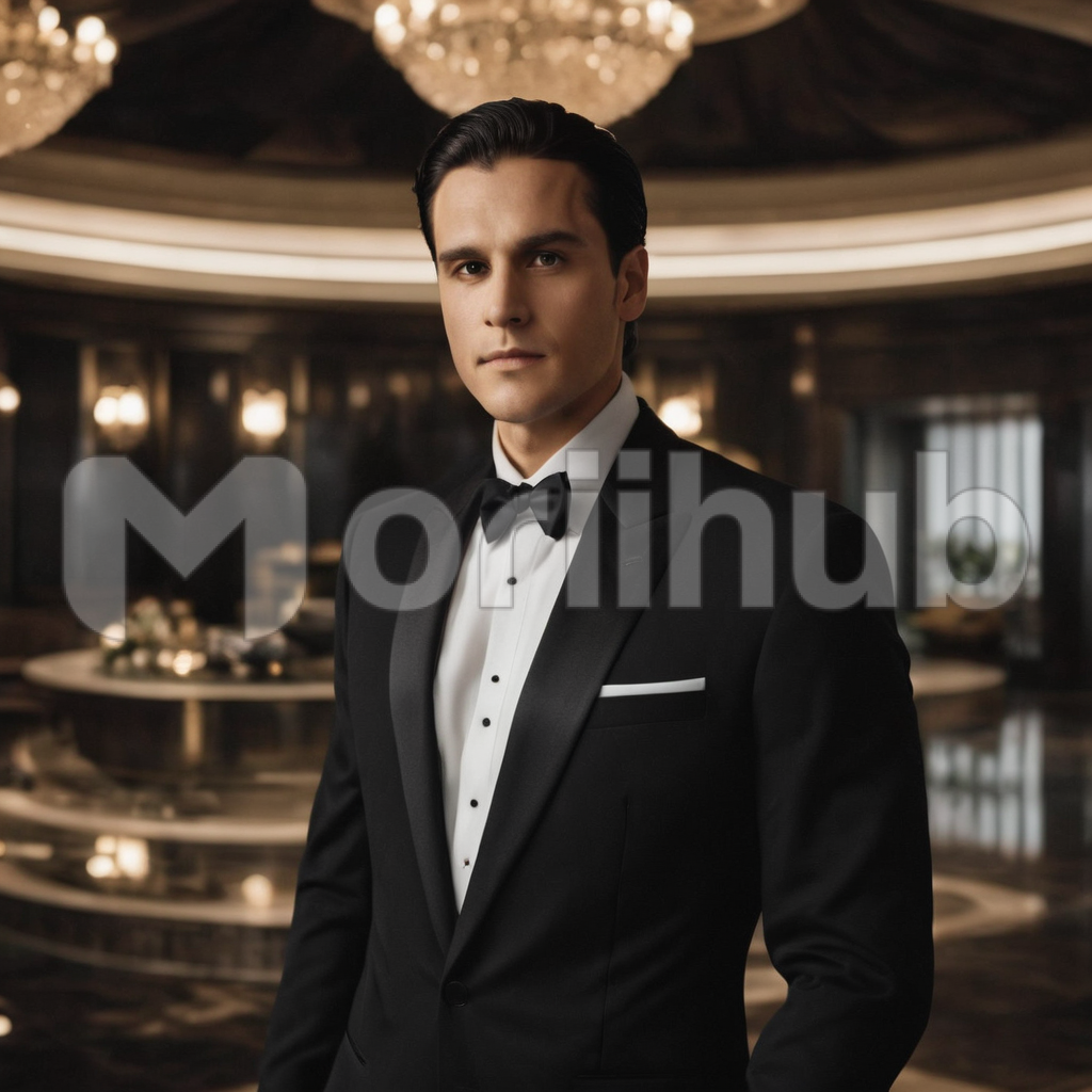 Dressed to impress, a man stands indoors, adorned in a tailored tuxedo that exudes refinement. The soft glow of indoor lighting highlights the sleek lines of his attire, casting a subtle elegance upon his figure. With an air of confidence, he commands attention, embodying sophistication and class. Whether he is at a formal event or simply enjoying an evening indoors, his dapper appearance leaves a lasting impression of style and grace.