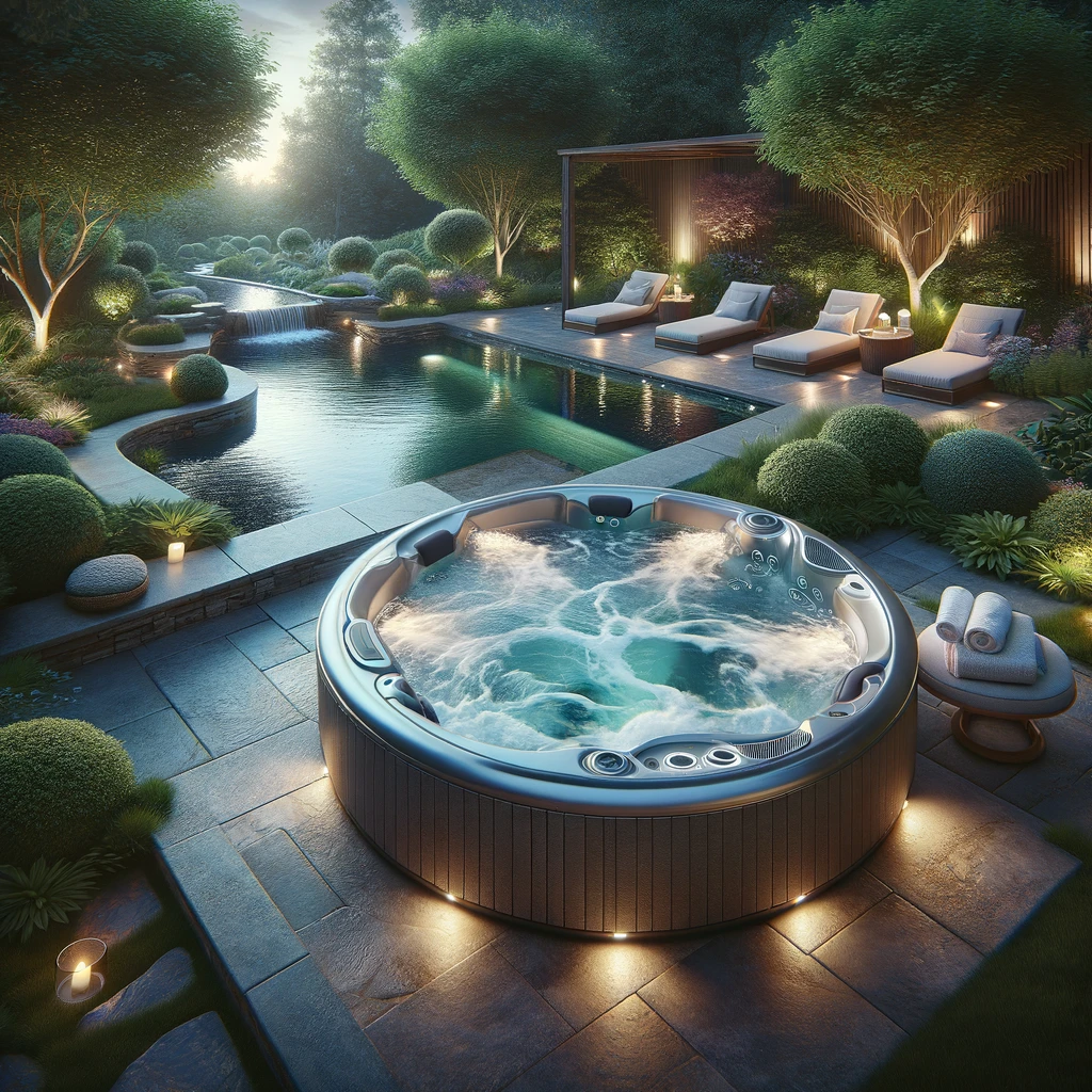 In the tranquil embrace of a meticulously landscaped garden, an elegant hot tub bath scene unfolds. The spacious, modern tub boasts sleek lines and powerful jets, inviting indulgence. Surrounded by lush greenery and blooming flowers, the setting exudes serenity. Here, one can luxuriate in blissful relaxation, immersed in nature’s soothing embrace.