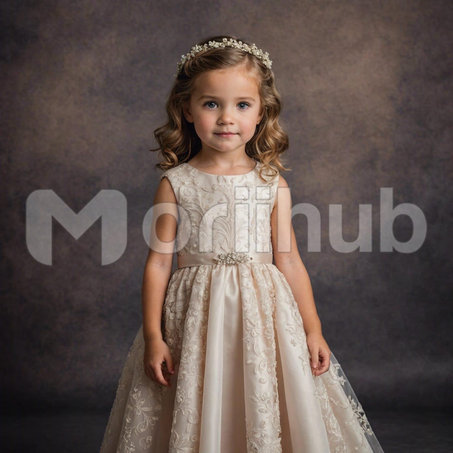 In a plain background, a cute little girl stands gracefully, adorned in a lovely gown that cascades around her small frame. Her hair is crowned with a delicate flower laurel, adding a touch of whimsy to her innocent expression. With wide eyes sparkling and a shy smile, she exudes a charm that captivates. The gown, adorned with intricate lace and gentle folds, complements her youthful elegance. Against the simple backdrop, she stands as a portrait of innocence and beauty, a small yet enchanting figure in a world of purity and wonder.