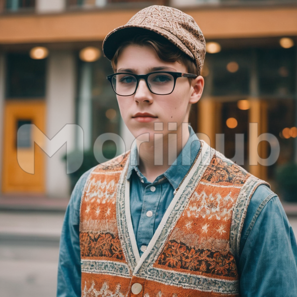 A young man emanates classic style, clad in a buttoned-down shirt, complemented by a suave sweater vest. He stands confidently, an embodiment of timeless fashion. A cap crowns his head with a touch of casual flair, while glasses add an intellectual edge. The ensemble creates a harmonious blend of sophistication and ease, capturing the essence of a modern, yet classically-inspired, fashion sensibility.
