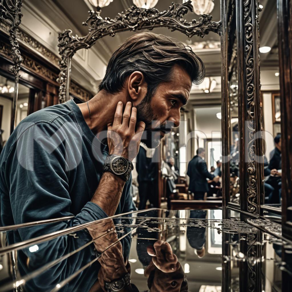 The man in the mirror reflection captures a moment of introspection and self-discovery. His image, subtly distorted by the glass, reveals layers of contemplation and emotion. Behind him, the environment echoes with subtle details, casting shadows and light that add depth to his gaze. It’s a portrait of introspective solitude, where the boundary between self and surroundings blurs, inviting reflection on identity, perception, and the passage of time.