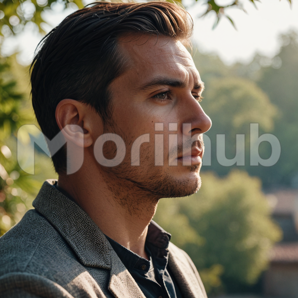 In a captivating side profile, a man gazes into the distance with an air of contemplation. His features are etched with depth, each line telling a story of experience and wisdom. With a serene expression, he exudes a quiet confidence and inner strength. Against the backdrop of the world unfolding before him, he stands as a stoic observer, embodying the timeless allure of introspection and thoughtfulness in his gaze.