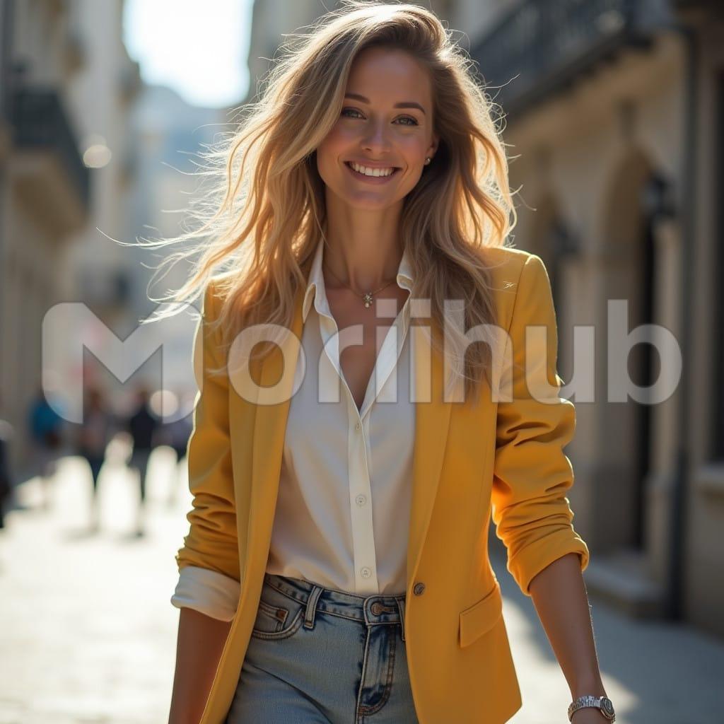 A beautiful woman walks down the street with grace and confidence. Her posture is poised, and her eyes reflect a warmth that draws attention. As she moves, the soft sway of her steps adds to her elegance. Her smile, bright and genuine, lights up her face, creating an inviting aura around her. The simple joy in her expression is contagious, bringing a sense of calm and happiness to those who notice her. She carries an effortless charm, making her presence feel both natural and captivating.