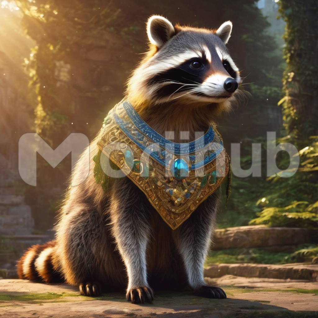 A mischievous raccoon sports a jeweled breastplate, an unexpected adornment amidst the forest’s shadows. The sparkling gems catch the light, adding a regal gleam to its playful antics. With a twinkle in its eye, it scampers through the undergrowth, a curious blend of wilderness and elegance. Nature’s beauty finds an unlikely canvas upon this furry creature, as it roams the woodland adorned with an air of unexpected sophistication.