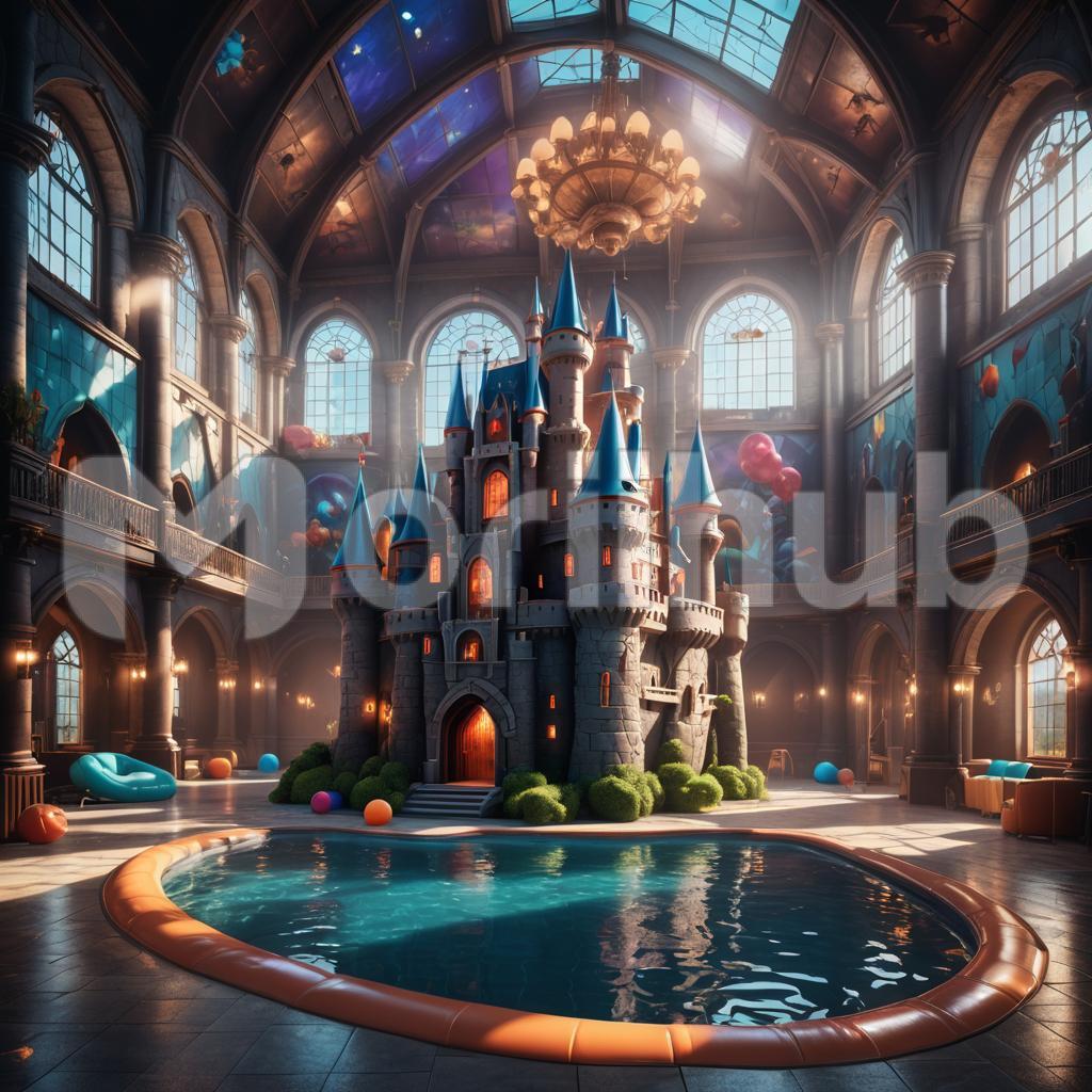 The castle is adorned with bright, cheerful colors and whimsical designs, including playful patterns and fun characters. Its inflated walls and floor provide a safe, bouncy surface for children to jump, tumble, and play. The room is filled with laughter and energy as kids bounce around, their movements causing the castle to sway and jiggle. Soft mats or cushioned flooring surround the castle, adding an extra layer of safety. The scene is filled with joy, creating a lively and festive atmosphere indoors.