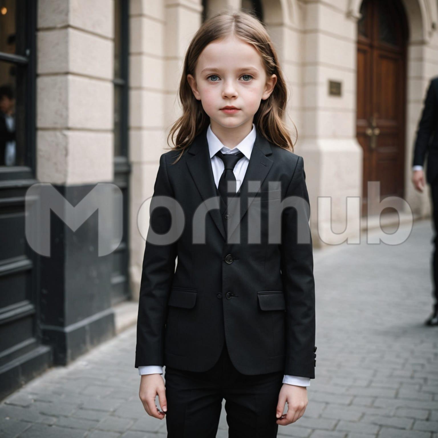 A cute little girl stands quietly, wearing a well-fitted suit. The jacket sits neatly over her shoulders, and the collar is smooth beneath her chin. Her hair is brushed back, tidy and even. She’s looking on, not speaking or moving, just observing with a calm, steady gaze. The suit doesn’t seem borrowed or oversized—it suits her, plain and direct. She doesn’t pose or perform, only stands as she is. There’s no strain in how she holds herself, only stillness and ease, as though both the moment and the suit belong to her.