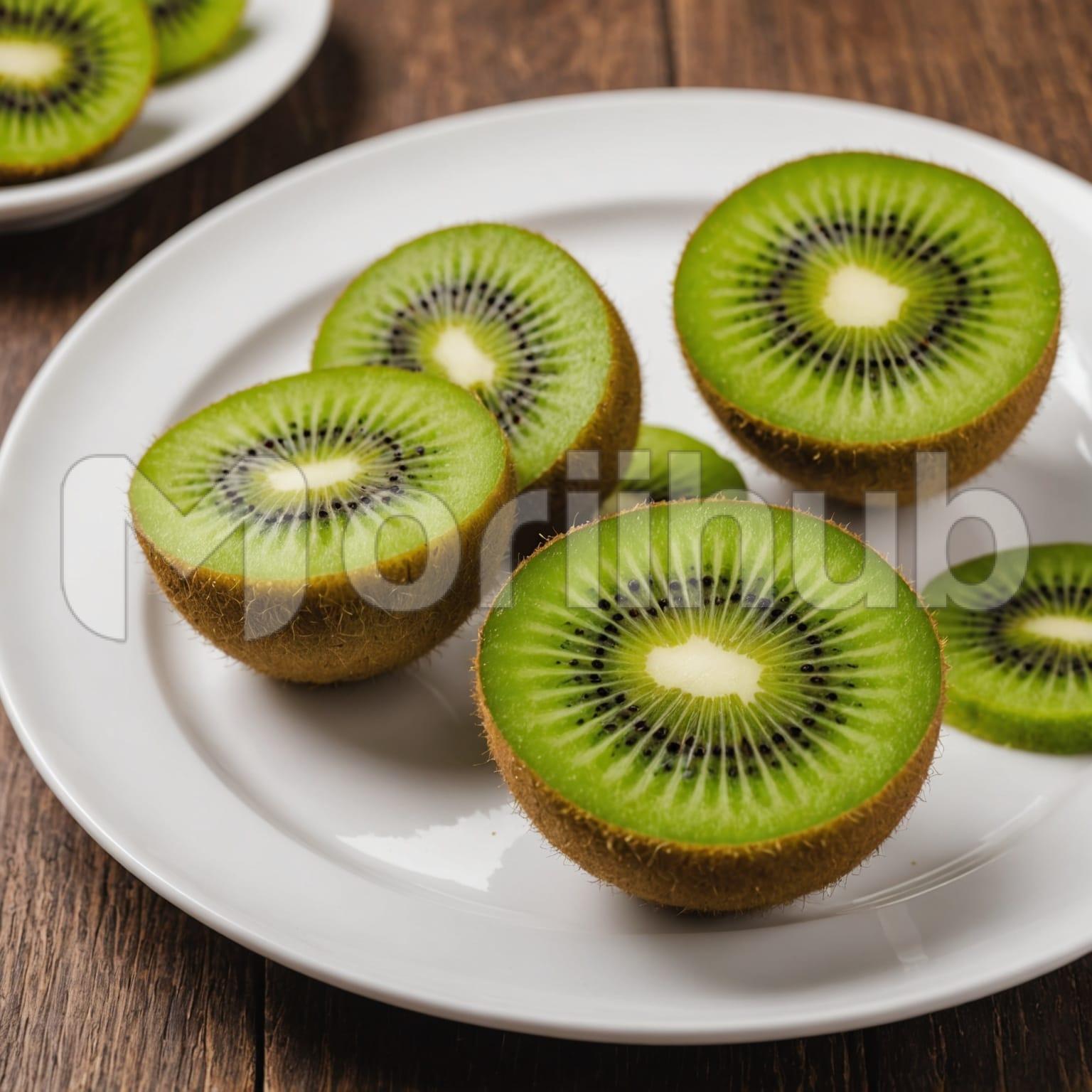 Kiwis sliced in half rest on a plate, each piece showing a smooth, rounded edge with a neat interior. The arrangement stays simple, with no clutter around the plate, allowing the sliced fruit to remain the clear focus. The surface of the plate is plain, offering no added detail, keeping the scene open and steady. The natural shape of the kiwis holds attention, with soft lines forming a quiet arrangement. The view stays balanced, shaped by the calm placement of the kiwis and the clean, uncluttered background supporting the simple display.