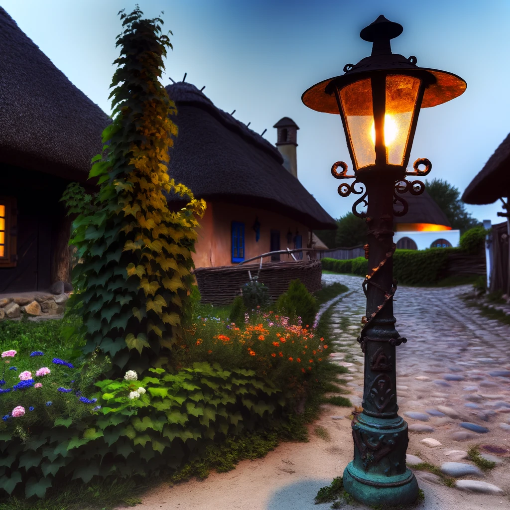 In this rustic and charming scene, a traditional village lamp post stands tall, exuding old-world charm and character. Crafted from wrought iron, its intricate designs showcase the craftsmanship of bygone eras. Against the backdrop of quaint village streets, the lamp post serves as a nostalgic reminder of simpler times, casting a warm and inviting glow upon the surroundings.