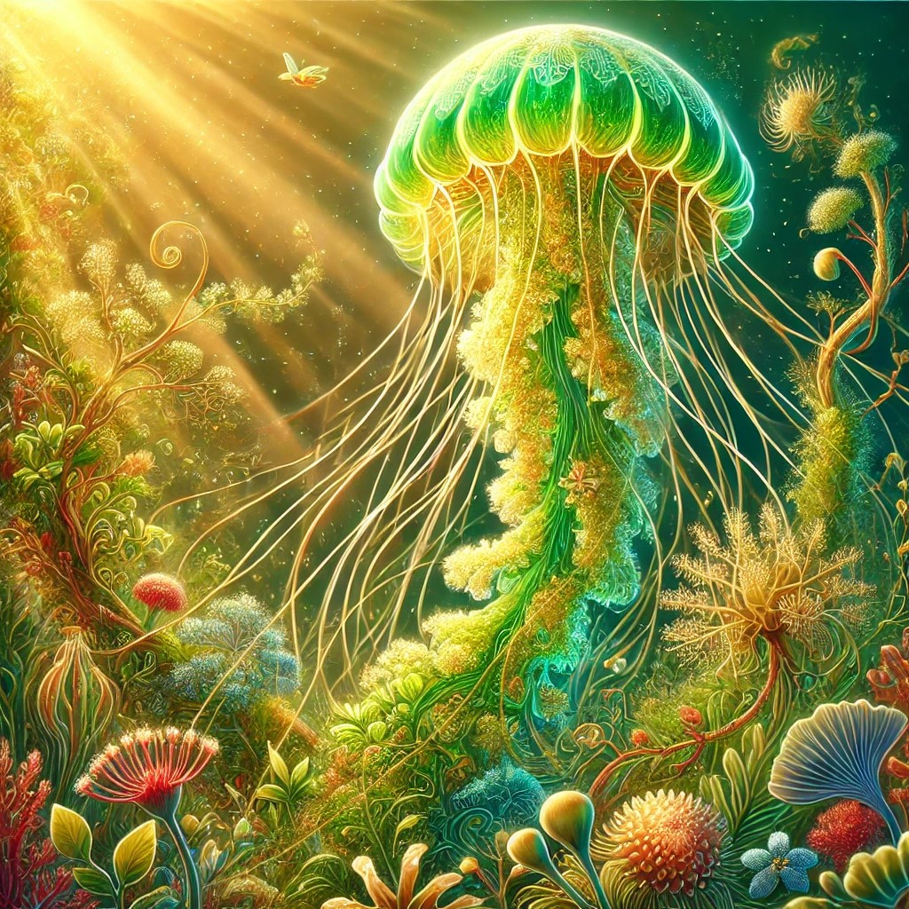 A vibrant, flourishing scene featuring a life jellyfish that embodies the essence of life and growth. The jellyfish has a radiant, glowing body in shades of green, gold, and warm earthy tones, with tendrils adorned with small blooming flowers and delicate vines. The tendrils flow gracefully as the jellyfish drifts through a lush, underwater environment filled with colorful corals, swaying plants, and various vibrant marine life.